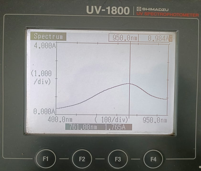 In a 25 ml beaker, add 10 ml standard stock solution B, warm it in a boiling water bath at 97 ± 1°C for 5 minutes, to this solution add 5 ml of 0.2Ammonium Molybdate and 5 ml of 0.2M Ninhydrin, and cool at room temperature. Use this solution for further dilutions as Stock solution C, which contains 1000 µg/ ml Nicotinamide. Scan the spectrum, and absorbance was measured at ? max at 761 nm versus the reagent blank (Figure 2).