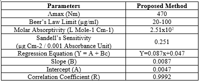 Abacavir undergoes diazotisation when treated with sodium nitrite and hydrochloric acid. The excess nitrous acid during the diazotisation is removed by the addition of urea solution. The solution was shaken frequently to allow the nitrogen gas to escape. The diazonium cation reacts with the coupling reagent, ?- naphthol to produce an orange azo coloured solution. The orange coloured solution is measured at 470 nm against reagent blank.. The colour of the product is stable for more than 24 hours. The calibration curve is linear over the range of 20-100 ?g/ml of abacavir. The optical characteristics of the proposed method such as absorption maxima, Beer´s law limits, molar absorptivity and Sandell´s sensitivity are presented in Table1. The molar absorp¬tivity and Sandell´s sensitivity values show that method is sensitivity. The regression analysis using method of least squares was made for the slope (b), intercept (a) and correlation (r) obtained from different concentrations and results are summarized in the Table 1. The value of correlation coefficient was 0.999, which indicated the good linearity of calibration lines. The percent relative standard deviation calculated from the five measurements of abacavir shown in Table.1. The % RSD is less than 2, which indicates that the method has good reproducibility. The standard deviation values are low indicates high accuracy and reproducibility of the method. The‘t’ calculated values are compared well with the theoretical value of 2.78 there by indicating that the precision of the method is good. There no effect of additives and excipients such starch, calcium lactose and glucose in the concentrations those present in general pharmaceutical preparations. The proposed method is simple, accurate, precise and selective for the estimation of abacavir in bulk and in dosage forms.