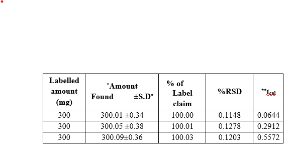Powdered tablet equivalent to 50 mg of the drug is weighed accurately and transferred into a 50 ml beaker and mixed well with 30 ml of methanol. The solution is filtered and transferred into a 50 ml volumetric flask and the volume is made up to 50 ml with methanol. The concentration of the drug solutions is now 1mg/ml. This stock solution is further diluted to obtain the working concentration of 100 µg/ml and analysed as under the assay procedure for bulk drug samples. The results are presented in Table.2.