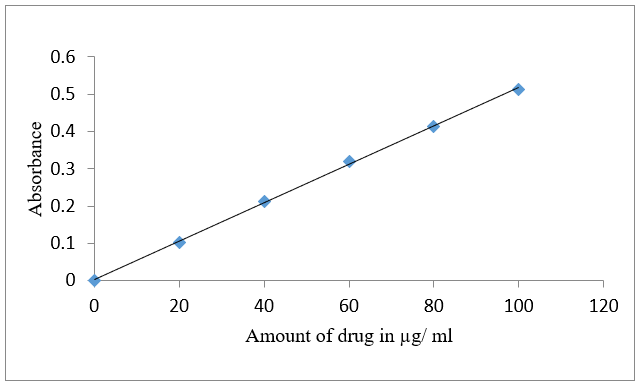 In the proposed method the lamivudine react with 2,3-dichloro 5,6-dicyano-p-benzoquinone solution to form red charge complex. The red coloured charge complex solution formed is measured at 450 nm against reagent blank. The amount of lamivudine read from calibration curve. The calibration curve is linear over the range of 20-100 μg/ml of lamivudine. The optical characteristics of the proposed method such as absorption maxima, Beer´s law limits, molar absorptivity and Sandell´s sensitivity are presented in Table.1. The molar absorptivity and Sandell´s sensitivity values show sensitivity of the method. The regression analysis using method of least squares was made for the slope (b), intercept (a) and correlation (r) obtained from different concentrations and results are summarized in the Table.1. The value of correlation coefficient (r) was 0.999, which indicated the good linearity of calibration lines. The percent relative standard deviation calculated from the five measurements of lamivudine shown in Table.1. The % RSD is less than 2, which indicates that the method has good reproducibility. The values of standard deviation values are low, indicates high accuracy and reproducibility of the method. The‘t’ calculated values are compares well with the theoretical value of 2.78 there by indicating that the precision of the method. There is no effect of additives and excipients such starch, calcium lactose and glucose in the concentrations those present in general pharmaceutical preparations. The proposed method is found to be simple, precise, accurate and time saving, reproducible and can be conveniently adopted for routine analysis of estimation of lamivudine in bulk drugs samples and pharmaceutical formulations.