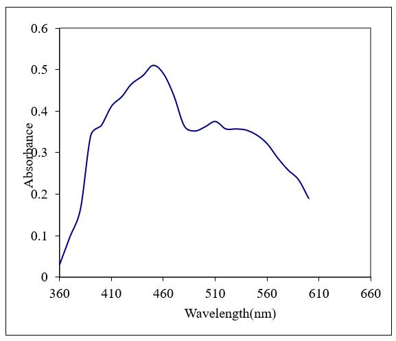 Procedure:1.0 ml of lamivudine solution (100 µg/ml) was transferred into a clean standard flask. To this solution 1.0 ml of 2,3-dichloro 5,6-dicyano-p-benzoquinone reagent was added to form red colour solution and the final volume was brought to 10 ml with methanol. The resultant red colour solution was allowed to stand for 5 min for complete the reaction. The absorbance of the red colour solution was measured in the wavelength range of 360 to 600 nm, against the reagent blank. The spectrum of lamivudine is given in fig.1. The spectrum shows the maximum absorbance of lamivudine at 450 nm.