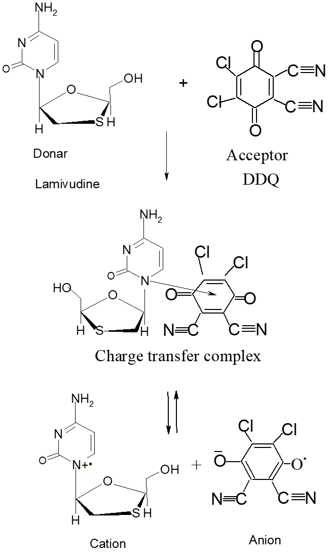 Lamivudine (2’-deoxy-3’-thiacytidine: 3TC) is a pyrimidine analog reverse transcriptase inhibitor that is active against HIV-1, HIV-2, and HBV. The molecule has two chiral centers and is manufactured as the pure 2R, cis (-)-enantiomer. The racemic mixture from which lamivudine originates has antiretroviral activity but it has less potency and is substantially more toxic than the pure (-)-enantiomer. Compared with the (+)-enantiomer, the phosphorylated (-)-enantiomer is more resistant to cleavage from nascent RNA/DNA duplexes by cellular 3'-5' exonucleases, which may contribute to its greater potency. Lamivudine has been used for treatment of chronic hepatitis B at a lower dose than for treatment of HIV. It also used with other medications to help control your HIV infection. Various Spectrophotometric1-11 methods, Titrimetric and Spectrophotometric methods12, 13, Simultaneous Spectrophotometric estimation of Lamivudine14-20, RP-HPLC and ultraviolet spectrophotometric method21, RP-HPLC method21,22, HPLC method22-27 and HPTL method28 has been reported in the literature for the estimation of lamivudine pharmaceutical formulations. In the present work lamivudine react with 2, 3-dichloro-5, 6-dicyano-1, 4-benzquinone to form an red colour charge–transfer complex. The reaction sequence of lamivudine is shown in scheme.1.