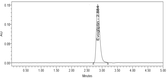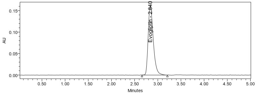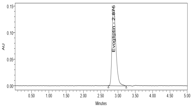 Specificity: Retention times of Evogliptin were 2.802 min. We did not found and interfering peaks in blank and placebo at retention times of these drugs in this method. So this method was said to be specific.
