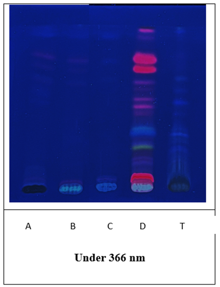 Figure 1- A: Amalaki; B: Ashwagandha; C: Vidari; D: Pippalli; T: Chyavanaprasam K tab