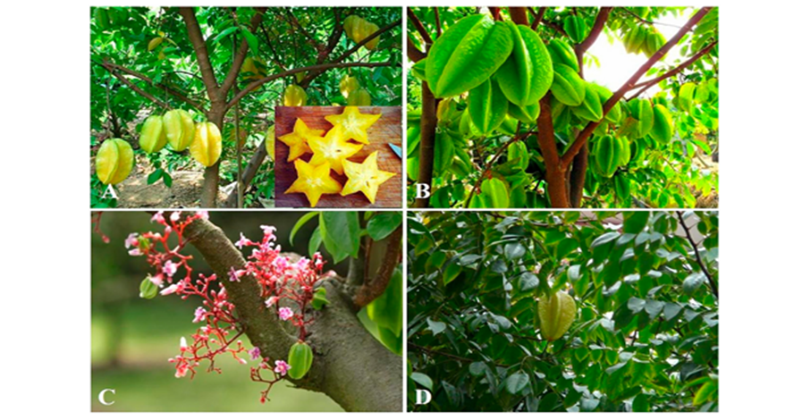 Traditional Medicine: Because of their possible health benefits, many elements of the starfruit tree—such as the leaves, fruit, and roots—have been utilized in traditional medicine throughout history.(6) Additionally, it boosts immunity, which aids in the elimination of harmful substances and the defense against common diseases. The star fruit's insoluble dietary fibers reduce cholesterol, promoting heart health. Additionally, it promotes healthy digestion and guards against colon cancer.(7) The star fruit, also called the carambola (Averrhoa carambola L.), is a visually appealing member of the Oxalidaceae family and is referred to as "Golden Star." Iron, fiber, and vitamins A and C are abundant in the fruit, which is primarily eaten fresh or in juice. Jam, jelly, and fermented or unfermented beverages can be made from the ripe fruit . The star fruit is green, yellowish green, unripe, semi-ripe, and ripe in appearance. It has a tart, fruity scent and is perishable.(8) Its hypoglycemic properties are thought to be especially helpful for those with diabetes mellitus, and it has been marketed as a conventional treatment for the disease. However, in patients with both normal and poor baseline renal function, increased star fruit consumption has been linked to the development of oxalate nephropathy.(9) The tree is grown all over the world in tropical regions. In addition to its many common names, it is also known as "Kamrakh" in Hindi and Gujrati, "Star fruit" in English, "Kamranga" in Bengali, Karambal in Marathi and Konkani, Karambal-drakshi, Kaparakshi hannu (Kannada), "Carmbala" in Marathi and "Konkani," "Kaparakhi hannu" in Kannada, "Chaturappuli and Vajrappuli" in Malayalam, Karmanga in Oriya, Thambaratham in Tamil, Ambanamkaya (Telugu), and Kordoi, Rohdoi in Assam.(10)