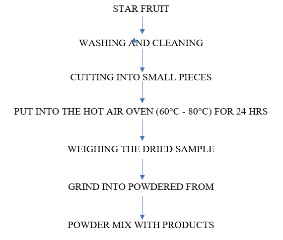 The first step in preparing the star fruit was washing it to get rid of any dirt or debris. It was then dried after being chopped into tiny chips. On a drying sheet, the chips were arranged in a single layer and heated to between 60 and 80 degrees Celsius for 24 hours. The dried star fruit chips were then crushed with a grinder.