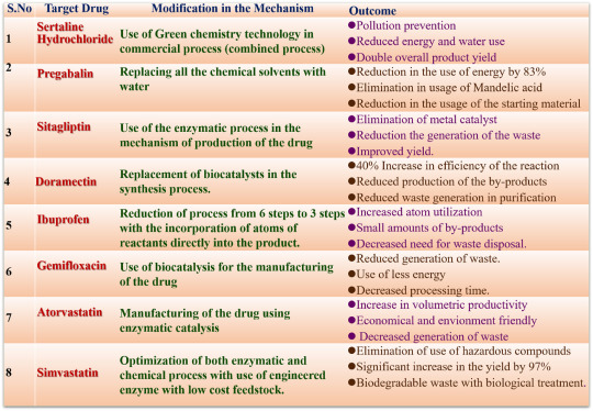 Below is a table describing the case studies of different drugs along with their outcomes and the structures of industrially manufactured drug molecules prepared by green synthesis methods.