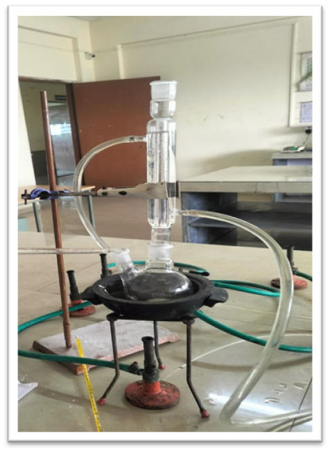 Glassware: two- rounded flask, condenser, burner, pipette, stirrer, beaker.