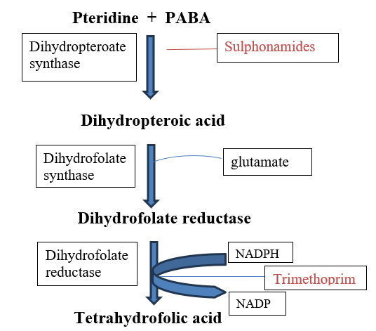 1. Inhibition of folic acid synthesis: By competing with para-aminobenzoic acid (PABA) for the enzyme dihydropteroate synthase, sulphonamides prevent bacteria from synthesizing folic acid.