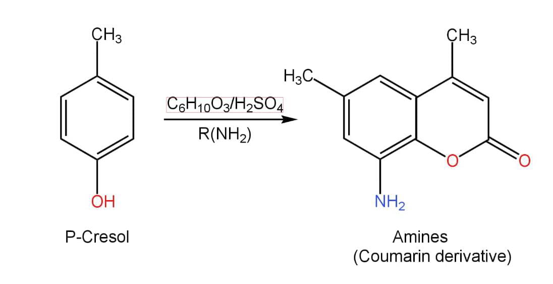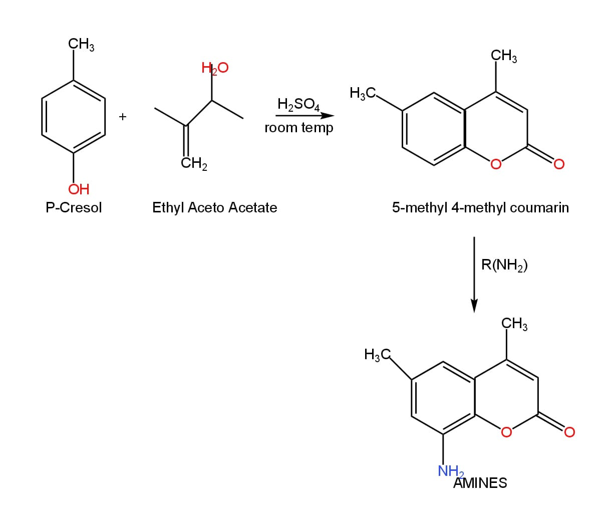 75 ml of concentrated sulphuric acid is placed in a beaker which is immersed in ice bath until the temperature of the acid falls to below 100C. Required quantity of phenols [P. Cresol, Hydroquinone] is added to 22ml of ethyl acetoacetate and stirred continuously until complete solution is obtained in another beaker. This solution is added complete to concentrated sulphuric acid, so that the temperature of the reaction mixture doesn’t rise above 100C.The reaction mixture is kept at room temperature with occasional stirring and poured it with vigourous stirring into a mixture of crushed ice. The precipitate is collected by filtration through action pump.It is then washed with cold water. The precipitate is dissolved in 10% NAOH and reprecipitated by adding dilute sulphuric acid or dilute hydrochloric acid. The precipitate is collected by filtration at the pump. Re-Crystallisation is done from ethanol and the percentage yield is reported.