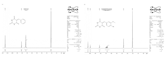 Figure 5: (a) 1H NMR of 5-Benzylidene barbituric Acid; (b) 1H NMR of 5-(4-Hydroxy-3-Methoxy-Benzylidene BA: