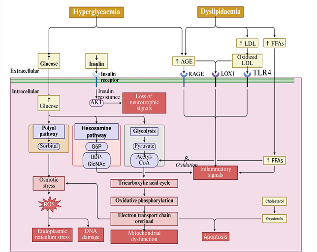 Notable metabolic disruptions, including hyperglycemia and dyslipidemia are major contributors of acute and chronic inflammatory reactions especially in metabolic diseases like diabetes, and cardiovascular disease. Continued hyperglycemia positively favors the development of advanced glycation end products that react with their receptor on endothelial cells, macrophages, and other immune cells. Such an interaction produces intracellular signaling that: (i) results in the increased transcription of pro-inflammatory cytokines including tumor necrosis factor-a, interleukin-6, and interleukin-1b; (ii) in nuclear factor kappa B activation. Meanwhile, hyperglycemia increases the oxidative stress by overproduction of reactive oxygen species in the mitochondria, which increases further the inflammatory signal and endothelial dysfunction. Dyslipidemia, which is the increase of the level of low-density lipoprotein, triglycerides, and the decrease of the level of the high-density lipoprotein is also involved in the process of inflammatory activity. Macrophages absorb the oxidized LDL using scavenger receptors and this encourages the formation of foam cells and the liberation of inflammatory mediators in the vascular tissues. This causes the activation of the toll-like receptors and inflammasome complexes like NLRP3, which exert additional stimulatory effects on cytokine synthesis and the recruitment of immune cells. Further, lipotoxicity, mitochondrial dysfunction, and stress-related pathways such as c-Jun N-terminal kinase and protein kinase C are induced by abnormal lipid accumulation in metabolic tissues liver, adipose tissue and vascular endothelium. These pathways scramble the insulin signaling and also make the inflammatory responses worse. Oxidative stress that hyperglycemia induces and lipid toxicity that dyslipidemia causes coexist to form a chronic low-grade inflammatory condition commonly known as metabolic inflammation or metaflammation. This ongoing inflammatory condition helps to promote endothelial injury, atherosclerotic plaque formation and further cardiovascular complication progression, which is often seen in metabolic diseases. Consequently, a detailed elucidation of the interactive molecular mechanisms between hyperglycemia and dyslipidemia and inflammatory signaling can be advantageous in devising treatment plans that can be used to mitigate the effects of inflammation to avert the metabolic and cardiovascular problems Fig.1.