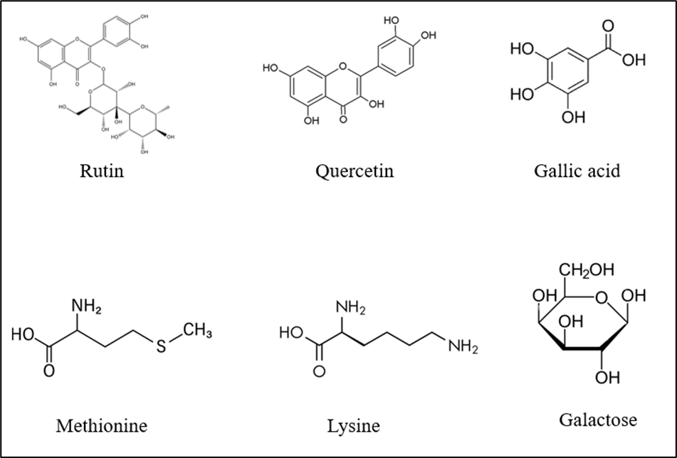 According to the study, Terminalia catappa L. leaves included terpenoids, alkaloids, tannins, steroids, cardiac glycosides, flavonoids, phenols, saponins, and coumarins [17]. Punicalin, punicalagin, gallic acid, and a derivative of isovitexin were found in T. catappa leaves. Eleven chemical constituents, including gallic acid, catechin, chlorogenic acid, caffeic acid, ellagic acid, epicatechin, rutin, quercitrin, isoquercitrin, quercetin, and kaempferol, were also identified by chemical characterization of the phenolic-rich extracts of T. catappa. Additionally, the leaf and stem bark revealed eight chemical constituents, including gallic acid, catechin, caffeic acid, ellagic acid, resveratrol, rutin, quercetin, quercetin, and kaempferol phenolic compounds, respectively [18]. T. catappa seeds that have been air-dried have 52.02% fat, 25.42% protein, 14.6% fiber, and 5.98% sugar. Likewise, its gum is said to include uronic acids (19%), galactose (20%), arabinose (59%), mannose (1%), and xylose (1%). Phosphorus (P) is the most prevalent macro-element in T. catappa's defatted kernels (1804 mg/100g), followed by potassium (K) (1718 mg/100g), magnesium (Mg) (729.09 mg/100g), calcium (Ca) (415.01 mg/100g), and sodium (Na) (37.60 mg/100g). Iron (Fe) (16.15 mg/100 g) is the most abundant microelement, followed by manganese (Mn) (4.25 mg/100 g), copper (Cu) (4.63 mg/100 g), and zinc (Zn) (9.67 mg/100 g). Leucine, isoleucine, valine, phenylalanine, tryptophan, methionine, lysine, threonine, histidine, tyrosine, arginine, aspartic acid, glutamic acid, glycine, alanine, serine, cysteine, and proline are among the necessary amino acids that can be found in its nuts and seeds. Along with a few non-essential amino acids, the nectar of the flower contains the five essential amino acids—arginine, histidine, lysine, methionine, and threonine [4].