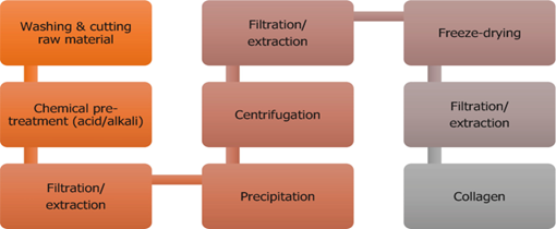 Acid extraction is the most commonly used, mainly for fish by-products, jellyfish. The method starts by washing the raw material with distilled water, cut into small pieces, and chemically treated with sodium hydroxide (NaOH) to remove non-collagenous proteins. In some cases, additional extra steps are essential, such as fat removal required for collagen extraction from codfish swim bladders or even the demineralization/ decalcification that is required for the isolation of collagen from scales, cartilage, or bone.Later, collagen isolation was achieved using an acetic acid solution, followed by centrifugation. Finally, the remaining biomass can be re-extracted following the same procedure. Furthermore, the collagen was precipitated by the addition of sodium chloride (NaCl) is separated by centrifugation, purified by dialysis, and finally lyophilized . The extraction methods to obtain collagen using acidic methodology
