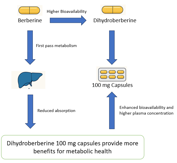 Dihydroberberine is a more bioavailable form of berberine, an alkaloid extracted from Berberis aristata, traditionally used in Ayurvedic and other medicinal practices. While berberine has long been acknowledged for its health benefits, particularly in managing metabolic conditions like diabetes and obesity, its primary limitation is its poor bioavailability [24]. The body does not absorb berberine efficiently, which limits its therapeutic potential. Dihydroberberine, however, addresses this issue by being more easily absorbed into the bloodstream, allowing for greater effectiveness even at lower doses, such as the 100 mg Dihydroberberine capsules [25].