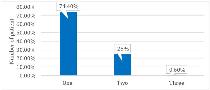 Commonly prescribed antibiotics: The prescriptions were classified into those containing a single antibiotic, which accounted for 74.4% (n=134), and those containing multiple antibiotics, which accounted for 25.5% (n=46). (Figure 02).