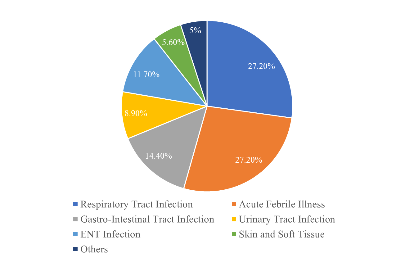 Indication for prescribed antibiotics: Respiratory tract infections and acute febrile illnesses were the most common indications for antimicrobial use, each accounting for 27.2% (n=49). These were followed by gastrointestinal infections at 14.4% (n=26), ear, nose, and throat (ENT) infections at 11.7% (n=21), urinary tract infections at 8.9% (n=16), and skin and soft tissue infections at 5.6% (n=10). Other indications accounted for 5.0% (n=9) and included dengue fever, jaundice, hyponatremia, anaemia, and uncontrolled diabetes mellitus (DM) (Figure 01).