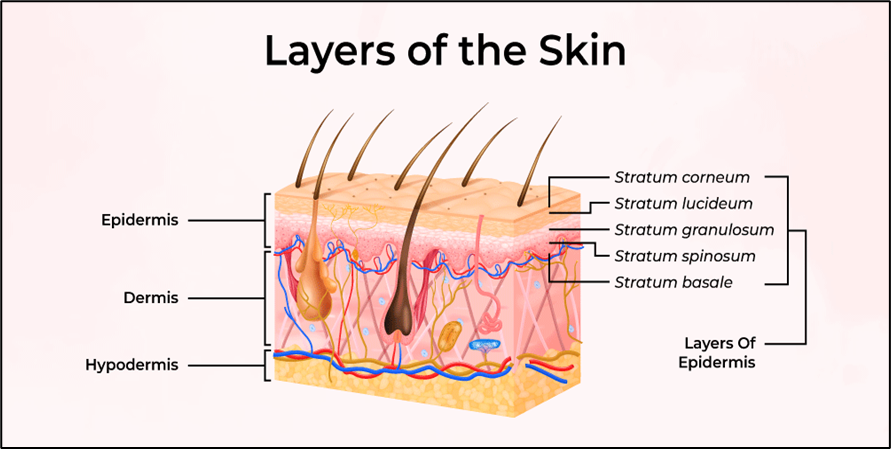 The stratum corneum, the outermost layer of the epidermis, is typically 10 to 20 mm thick in most areas of the body. It is also known as ‘Horny layer’ which is made up of keratin filled dead corneocytes [2]. It consists of intercellular lipids and corneocytes, which are dead, flattened cells. Corneocytes have a hexagonal shape, contain keratin, and are enclosed by a protein-reinforced envelope made up of various proteins, including involucrin, loricrin, filaggrin, proline-rich proteins, and keratolinin [3]. Corneocytes originate from keratinocytes, the proliferative cells of the epidermis. As keratinocytes divide and migrate upwards through a process called differentiation, they undergo structural and biochemical changes. By the time they reach the stratum corneum, they lose their nuclei and organelles, transforming into protein-rich, flattened sacs. Although the stratum corneum is often considered a nonviable part of the epidermis, any disruption to this layer triggers a series of responses in both the stratum corneum and the underlying viable epidermis, such as alterations in protease activity, lipid biosynthesis, aquaporin (AQP) function, and filaggrin expression [4]. Stratum corneum known as Brick-and-Mortar model. The rigid keratin filled corneocytes are the bricks and the intercellular lipids are the mortar. The intercellular lipids, along with lectins, desmosomes and corneodesmosomes, bind to corneocytes that help to hold them in place [5]. It is the physical arrangement of corneocytes and lipids which enables the skin to resist high trans epidermal water loss (TEWL). Desquamation: Desquamation or peeling skin is the shedding of dead cells from the outermost layer of skin. The entire process from cell birth to the “desquamation” of the corneocyte cells takes three to four weeks.