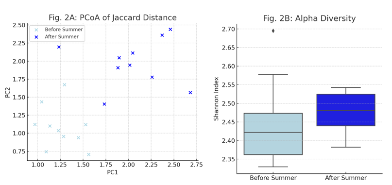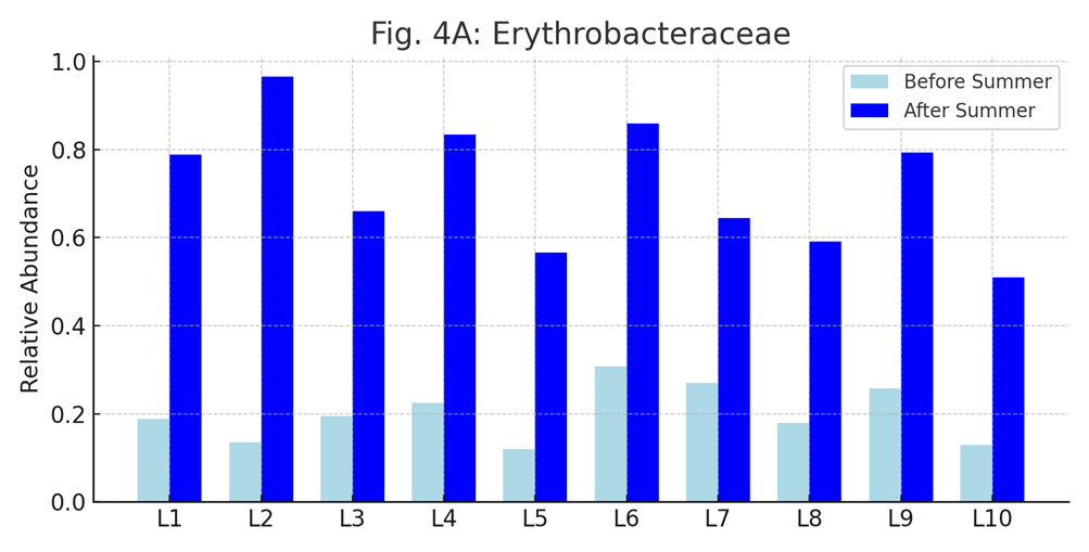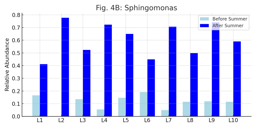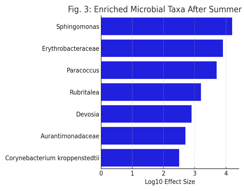 Fig. 3: LEfSe analysis identified specific bacterial taxa that increased in relative abundance after the summer. The figure displays taxa (at family or genus level) present in at least 50% of volunteers, with notable increases in Sphingomonas and Erythrobacteraceae.