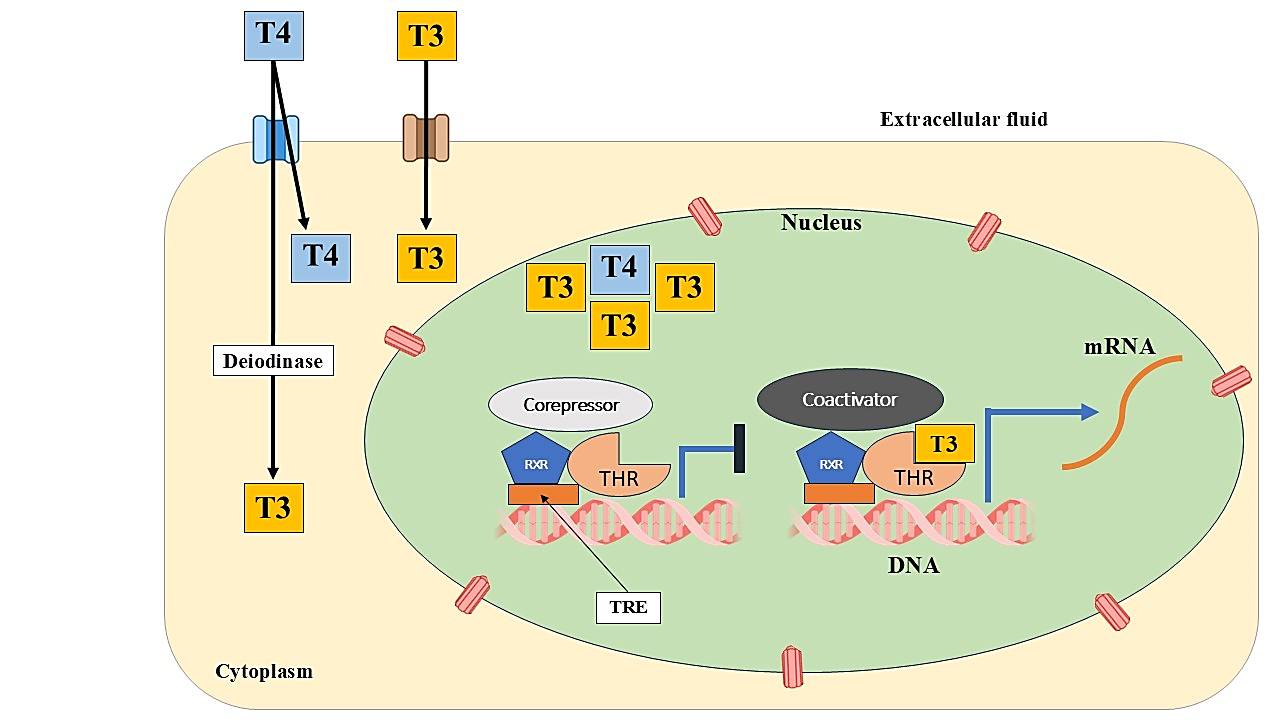 Figure 2: Depiction of the intracellular signaling mechanism of thyroid hormones (TH). Cellular uptake of TH is facilitated by specific transport proteins. Once inside the cell, T4 may be converted to T3 by the enzyme DIO2. Although not depicted, DIO1 also plays a role in this conversion. T3 and T4 interact with thyroid hormone receptors (THRs), which are primarily bound to retinoid X receptors (RXRs). This binding induces a structural change in the THRs, resulting in the release of corepressors and the recruitment of coactivators, thereby initiating the transcription of genes located downstream of thyroid hormone response elements (TREs).