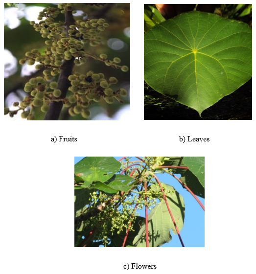 Fig. No. 2: Morphology of Macaranga peltate a) fruits b) leaves c) flowers.