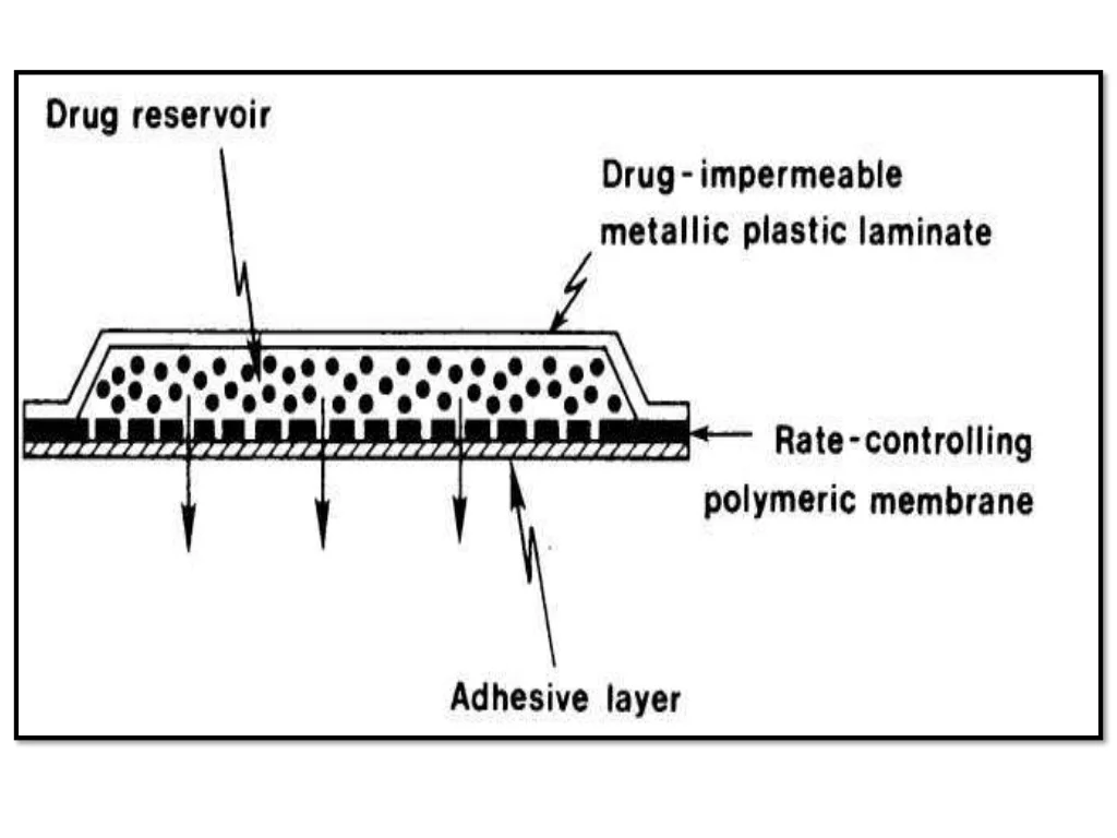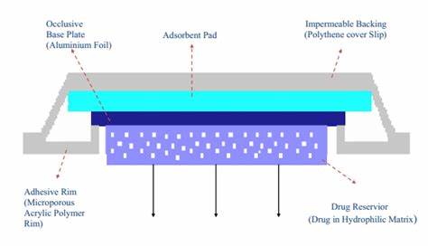 A shallow compartment made of a drug-impermeable metallic plastic laminate and a rate-controlling polymeric membrane—which may be microporous or non-porous—encloses the drug reservoir in this kind of device. Only through the rate-controlling polymeric membrane are the medication molecules allowed to release. The drug Particles are either evenly spaced or in a solid polymer matrix (like polyisobutylene adhesive) or suspended in a viscous, unbleachable liquid medium (like silicon fluids) to create a paste-like suspension in the drug reservoir compartment.21