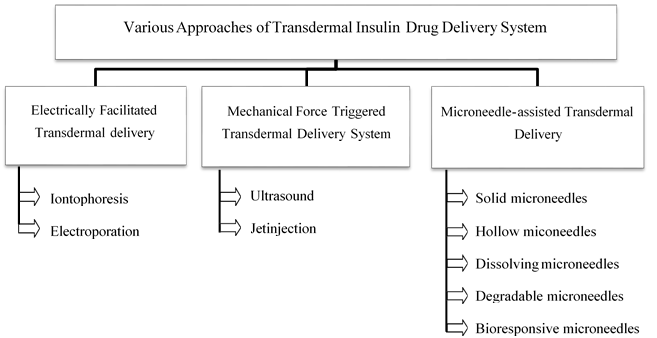 People with type 1 diabetes require insulin therapy to control their blood glucose levels, and advanced type 2 diabetes patients frequently take it as well. The traditional method of delivering insulin is subcutaneous injection with a hypodermic needle or pump-mediated infusion, although these methods may cause pain, needle anxiety, poor adherence, and an increased risk of infection. Transdermal insulin administration has so been extensively researched as a desirable alternative to subcutaneous techniques for the management of diabetes in recent years. Transdermal methods that deliver controlled, continuous insulin release and limit insulin breakdown may be preferable for patients and improve adherence and glycemic results. Due to the protein drug's high molecular weight, passive insulin absorption via the skin is inefficient, which presents a problem for transdermal insulin delivery. In this review, we concentrate on the many transdermal insulin administration strategies, including chemically promoted, electrically enhanced, mechanical force-triggered, and microneedle-assisted ones, along with their corresponding benefits and drawbacks.