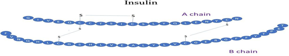 Insulin is a peptide hormone composed of two polypeptide chains, A chain and B chain, which are linked by disulfide bonds. The A chain contains 21 amino acids, while the B chain contains 30 amino acids, and the two chains together contain a total of 51 amino acids (Fig-1) [24]. The sequence of these amino acids determines the three-dimensional structure of the insulin molecule. The insulin molecule has a unique shape, with a central core formed by the B chain, surrounded by two extended arms formed by the A chain. Insulin is a relatively stable molecule, with a melting point of around 60-70°C, and is soluble in water and dilute acids. It is stable in acidic pH, but undergoes rapid denaturation and aggregation at alkaline pH. Insulin is sensitive to heat, acid, and proteolytic enzymes [25].
