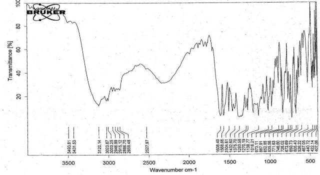 The solubility study of the drug in various solvents revealed significant differences. As shown in Table 8, the drug exhibited good solubility in water (42 mg/ml), methanol (8 mg/ml), ethanol (1 mg/ml), and chloroform (15 g/ml). Among these solvents, the highest solubility was observed in water, followed by methanol, chloroform, and ethanol. This indicates that water is the most suitable solvent for the drug, while ethanol shows the least solubility.