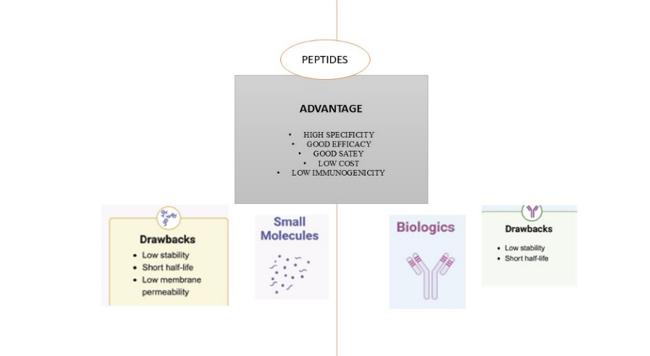 Figure 1. benefits and drawbacks of medications based on peptides. Three different types of therapeutic agents are represented by peptides, small molecules, and biologics. Comparing peptides to the other two classes reveals certain advantages. However, compared to peptides, small molecules have some drawbacks, while biologics have additional restrictions.