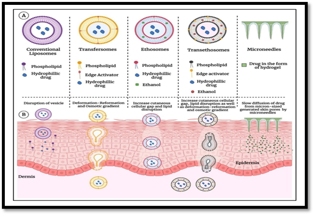 In addition to intravenous and oral methods, transdermal administration is another practical and appropriate way to provide medications. Patients are spared the agony of intravenous injections, and it is especially necessary for diseases involving motion sickness, nausea, and vomiting. [1,2] The transdermal route offers a number of benefits over other conventional routes, including preventing liver metabolism, reducing undesirable side effects, delivering drugs efficiently with a short half-life, improving pharmacological and physiological response, reducing blood level fluctuations, and most importantly—improving patient compliance. [3,4] One of the main issues with dermal and transdermal drug delivery methods is the permeability of the stratum corneum. Made up of flattened, keratinized epidermal cells, the stratum corneum is the outermost layer of the epidermis. Chemical transfer is hampered by watertight cells with a strong, flexible membrane, making this mode of administration inadequate for therapeutic use. A new method for getting beyond the stratum corneum barrier without damaging it is to encapsulate the medication in a vesicular system. Vesicles are composed of an interior hydrophilic core enclosed in a bilayer wall of phospholipids or surfactants, according to structural analysis. Many researchers have introduced different types of alterations to make a novel vesicles which have significantly improved their penetration across the entire skin. A few examples of such modified vesicles include transferosomes, invasomes, flexosomes, ethosomes, menthosomes & niosomes.[5] Using a specific type of composite body called "transferosomes" and rational membrane design, a novel vesicular drug carrier system is created. Transfersomes are the most promising way to build an unique dosage form that delivers the medicine slowly and safely with minimal side effects. Transferosome is a trademark of IDEA AG and refers to patented drug delivery. The name is a mix of transfero and soma. Transferosome means to carry across in Latin, and soma means body in Greek, therefore it is a “carrying body”. Transferosomes are artificial vesicles meant to mimic a cell vesicle or a cell in exocytosis, making them ideal for controlled and potentially targeted medication delivery[6].