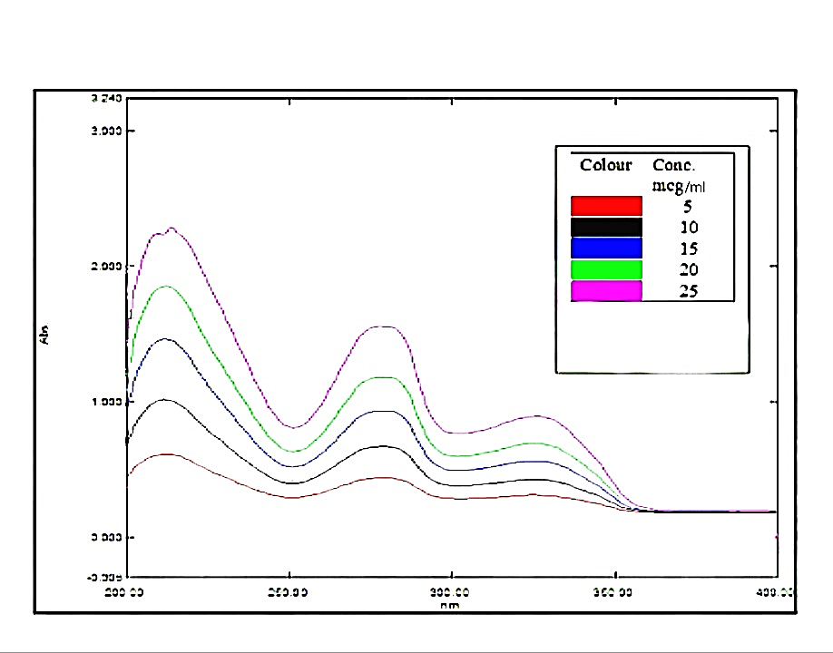 1, 2, 3, 4 and 5 ml of standard solutions was diluted up to 10?ml with distilled water in volumetric flasks. This resulted in solutions with concentrations of 5, 10, 15, 20, and 25?μg/ml, respectively. The absorbance of each solution was then measured at 277?nm, distilled water as the blank. Then absorbance vs concentration graph was plotted.