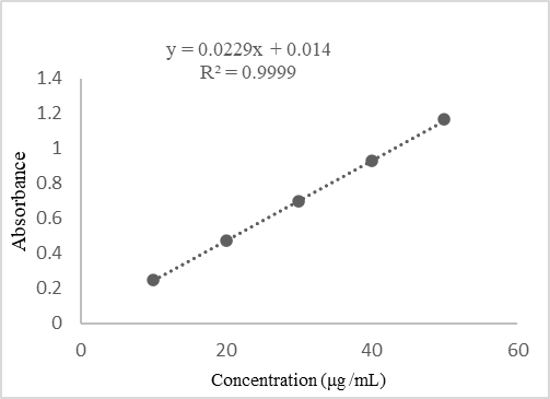 Linearity was performed along the concentration range of 10-50 μg/ ml. A calibration curve graph was plotted with Absorbance on the X-axis and Concentration on the Y-axis Regression Analysis showed R2 value as 0.9999 and the linear equation as y = 0.0229x + 0.014.