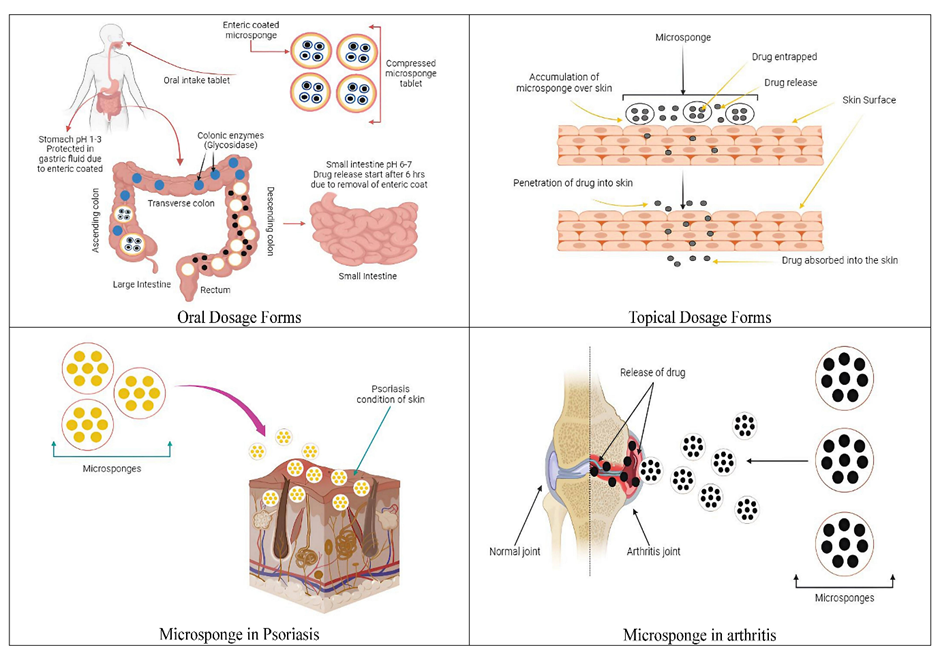 Furthermore, the utilization of microsponge technology shows potential in enclosing medications within a limited area and administering active components to the lower gastrointestinal tract in a regulated fashion. The primary rationale behind employing the microsponge system for delivering drugs to the colon is that active ingredients measuring less than 200 µm are easily assimilated by the macrophages present in colon tissues. This facilitates efficient targeted drug action at the intended site. [37]