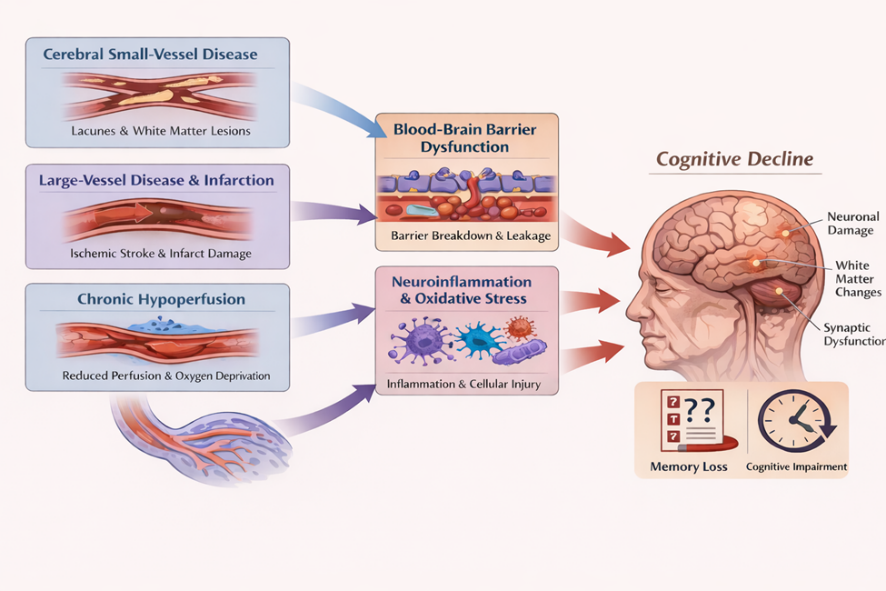 Chronic cerebral hypoperfusion induces cognitive decline through persistent impairment of neurovascular homeostasis rather than focal ischemic injury. Prolonged reductions in cerebral blood flow compromise oxygen and glucose delivery, leading to impaired mitochondrial respiration and subsequent metabolic energy failure, and increased production of reactive oxygen species within neurons and glia [15]. Hypoperfusion induced oligodendrocyte injury and subsequent axonal degeneration facilitate the breakdown of essential cortical and subcortical pathways, serving as the significant driver for slowed processing speed and executive dysfunction. [16]. In parallel to chronic hypoperfusion, disruption of the blood–brain barrier promotes neuroinflammation and the buildup of toxic metabolites, further exacerbate synaptic dysfunction and neuronal loss [17]. These interrelated pathways cognitive decline and potentiate the effects of coexisting infarction towards the VCID advancement.