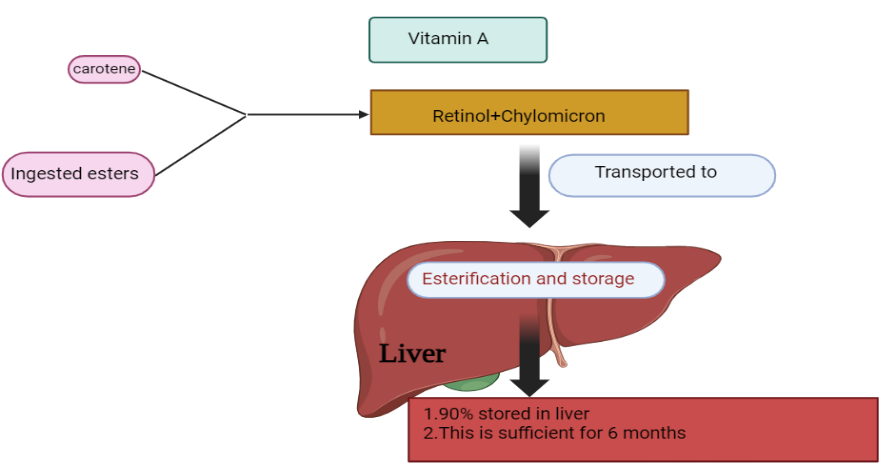 Vitamin A absorption occurs in the lumen of the small intestine. Micelles created with the help of bile acids are expelled from the gallbladder and picked up in the duodenum. Retinoid undergo further hydrolysis to yield retinol, and transport proteins help retinol absorb past the small intestine's brush barrier (2, 4). In the range of 70%-90% (preformed), vitamin A is absorbed through the stomach. Conversely, passive diffusion is how carotenoids are transferred. Retinol levels may take several months to return to normal following vitamin A poisoning due to the estimated 128-day half-life of vitamin A. In terms of storage, retinyl-esters are the most common. Enterocytes absorb the retinol and fatty acids produced when the digestive system breaks down the stored form of vitamin A. Retinol is made from beta-carotene and retinaldehyde, which are generated by the enzymatic conversion of carotenoids. Liver cells and cells lining of the intestines are responsible for processing. Retinol is converted into retinyl-esters by esterification with fatty acids. They enter the circulation after being integrated into chylomicrons in the liver. The circulatory system carries retinol to the hepatocytes and hepatic stellate cells. The most accurate measure of Vitamin A status is the hepatic retinyl-ester content. Only a small percentage of Vitamin A is deposited in the pancreas, intestines, kidneys, and lungs, which are the hepatic organs of the body; the majority (80%–90%) is stored in the liver (2, 4, 9, 11, and 12). The most common place to store vitamin A is lipocytes, pericytes, fat-storing cells, or vitamin A-storing cells. Renin is converted to retinyl-esters in the liver's stellate cells and then stored in lipid droplets when taken in through the diet. Whenever there is a shortage of retinol in the body, these retinyl-esters are transferred back to hepatocytes for their utilization. Retinol-binding proteins are solely responsible for retinyl esters' bidirectional transport (2, 4, 9, and 13) (as illustrated in figure: 01).