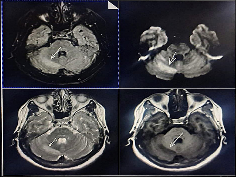 A 53-year-old-female presented to the emergency medical ward with chief complaints of sudden fall and was found unconscious in the bathroom around 2 PM with a gas geyser in use. On admission the patient exhibited altered sensorium, accompanied by irritability and restlessness with no prior medical history. Systemic examination was normal overall, with dyspnea noted on respiratory examination, sedation/drowsy and unsteadiness on neurological assessment and weakness on musculoskeletal evaluation. The Glasgow Coma Score (GCS) was E2V3M5, vitals were stable and the patient was afebrile. Random blood glucose (GRBS) was elevated at 338 mg/dL following which HbA1C, CBC and MRI investigations were ordered. The HbA1C level was 5.6 %, CBC was normal with increase in WBC count (14030 mcL), and MRI findings revealed subacute infarcts involving bilateral, medial, temporal lobes and in the right cerebellar hemisphere as shown in figure no 01. On the day following admission, the patient was conscious as well as oriented (E4V5M6) and a carotid doppler examination was conducted which demonstrated normal color uptake, flow velocities and spectral waveforms in both carotid and vertebral arteries, with no evidence of hemodynamically significant stenosis. On admission day, Arterial Blood Gas (ABG) report shows mixed acid-base disorder characterized by primary metabolic-acidosis with superimposed respiratory alkalosis, associated with severe hyponatremia, hyperkalemia, severe ionized hypocalcemia, and borderline lactic acidosis, with preserved oxygenation. After one day of inpatient care the ABG report shows mild metabolic acidosis with partial respiratory compensation. Based on the above subjective and objective evidence the patient was diagnosed with hypoxic ischemic encephalopathy secondary to gas geyser syndrome. Management include treatment with Inj. Pantoprazole 40mg for 8 days (OD), Inj. Ondansetron 4mg for 2 days (TID), Inj. Ceftriaxone 1gm for 8 days (BD), Inj. Piracetam 100mg for 8 days (BD) and Inj. Levetiracetam 1gm STAT f/b 500mg for 8 days (BD).