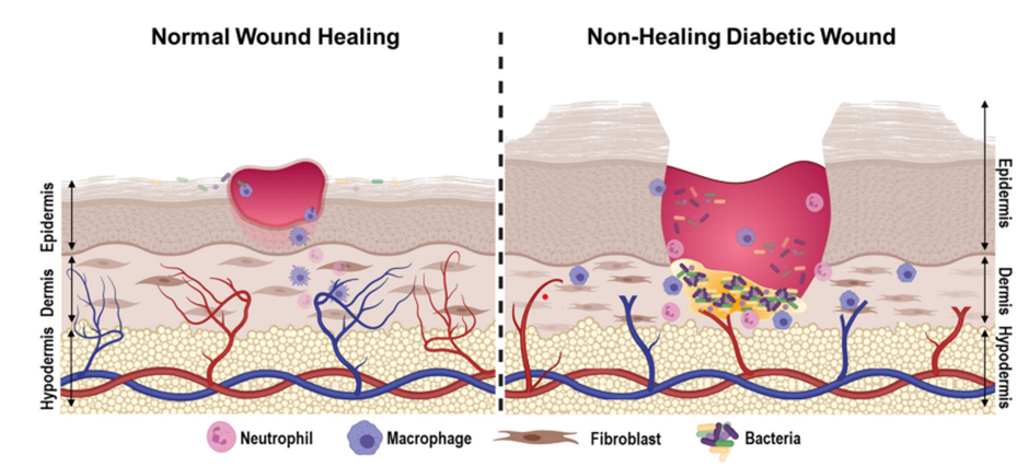 Diabetes-related chronic hyperglycemia interferes with several cellular and molecular functions necessary for healthy tissue repair. Key mechanisms include:
