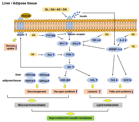 Figure 2. Mechanisms of insulin-sensitizing and glucose-lowering actions of Glycyrrhiza glabra (glycyrrhizin and glycyrrhetinic acid) in liver and adipose tissue.