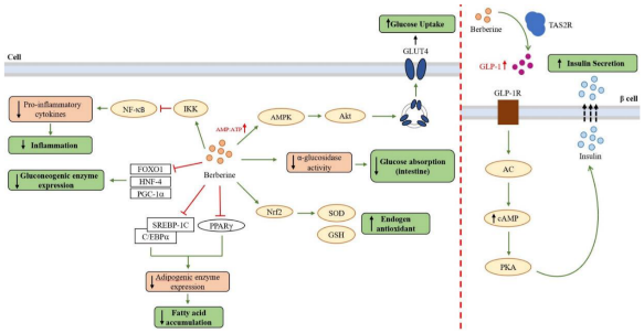 Multi-target impacts on glucose homeostasis are seen in all three plants (Figure 1). Numerous investigations on B. aristata show that berberine activates AMP-activated protein kinase (AMPK), which suppresses hepatic gluconeogenesis and lipogenesis while increasing glucose absorption and glycolysis. Additionally, berberine increases GLUT4 translocation and insulin signaling (IRS/PI3K/Akt pathway), which improves peripheral insulin sensitivity. It suppresses intestinal enzymes that break down carbohydrates, lowers inflammation (by inhibiting NF-κB), and may increase β-cell survival by raising incretin (GLP-1)[8][12].