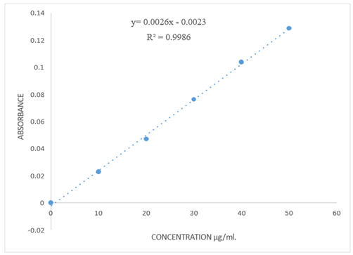 From the standard stock solution, a series of dilutions were prepared using phosphate buffer pH 7.4 to get concentration of 10-50 μg/ml. The absorbance of these solutions was measured using UV-spectrophotometer. Standard curve was obtained by plotting absorbance vs. drug concentration.