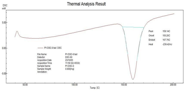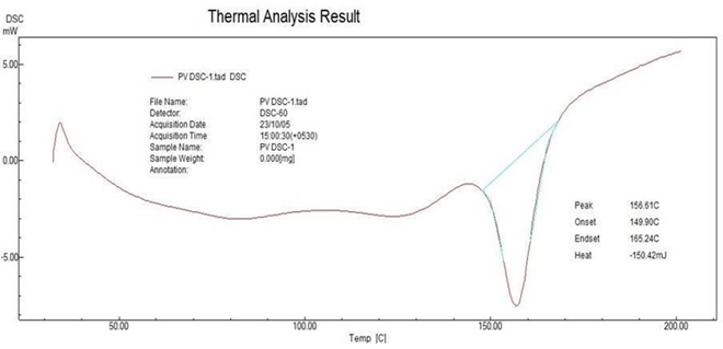 DSC (Perkin-Elmer thermal analysis) studies were carried out in order to characterize the physical state of drugs. Sample of pure drug and physical mixture were placed in the aluminum pans and thematically sealed. The heating rate was 10oC per misusing nitrogen as pure gas. The DSC instrument was calibrated for temperature using indium. In addition, the enthalpy calibration indium was sealed in aluminum pan with sealed empty pans as reference.