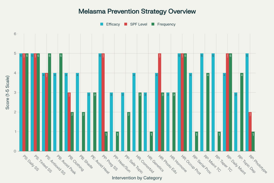 Melasma remains among the most resistant pigmentary disorders to treat, and prevention has become as important as treatment itself. Melasma has a wide variation in its global prevalence, ranging between 0.025 and 50%, depending on ethnicity and geographic region. Adequate prevention has been shown to greatly reduce its incidence and recurrence rates. This broad-based review covers evidence-based prevention strategies, including photoprotection, pregnancy-specific measures, strategies for high-risk populations, and mechanisms for preventing recurrence.
